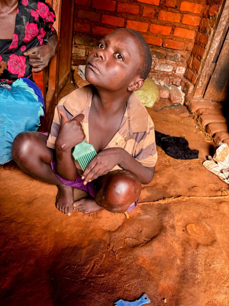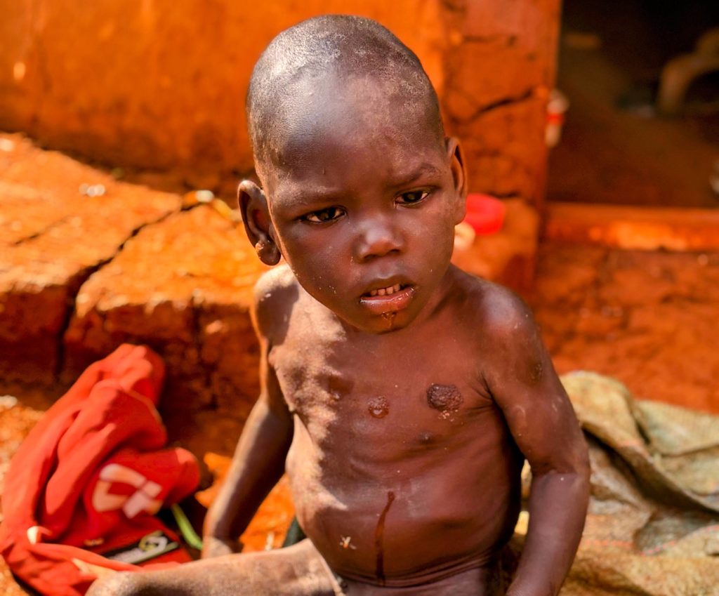 L. , 3 Jahre, wiegt nur 10 kg. Wir fanden ihn nackt, abgemagert, verschmutzt und mit Wunden am Kopf, weil er nicht stabil sitzen kann und immer wieder stürzt. Er hatte Tuberkulose. Die Familie lebt so abgelegen, dass wir nur zu Fuß hinkamen. Seine Situation ist