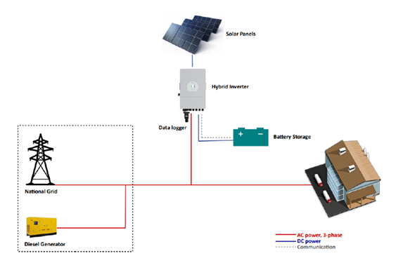 Die nun geplante Solaranlage für das CT im Naggalama Krankenhaus ist als Hybridanlage mit Batteriespeicher konzipiert. Die 50 kWp starken Solarpanels werden auf dem Dach neben der bestehenden Anlage installiert. Die Hybrid-Wechselrichter und Lithium-Ionen-Batterien stammen vom renommierten Hersteller Deye und werden im Technikraum untergebracht. Die Anlage ist so ausgelegt, dass der CT unabhängig vom öffentlichen Stromnetz betrieben werden kann und eine unterbrechungsfreie Stromversorgung gewährleistet ist. Zusätzlich wird die Anlage an das Stromnetz sowie an die zentrale Stromversorgung des Krankenhauses angebunden. Dadurch können die Batteriespeicher bei Bedarf auch über das Netz geladen werden und überschüssiger Solarstrom kann anderen Bereichen des Krankenhauses zur Verfügung gestellt werden.
